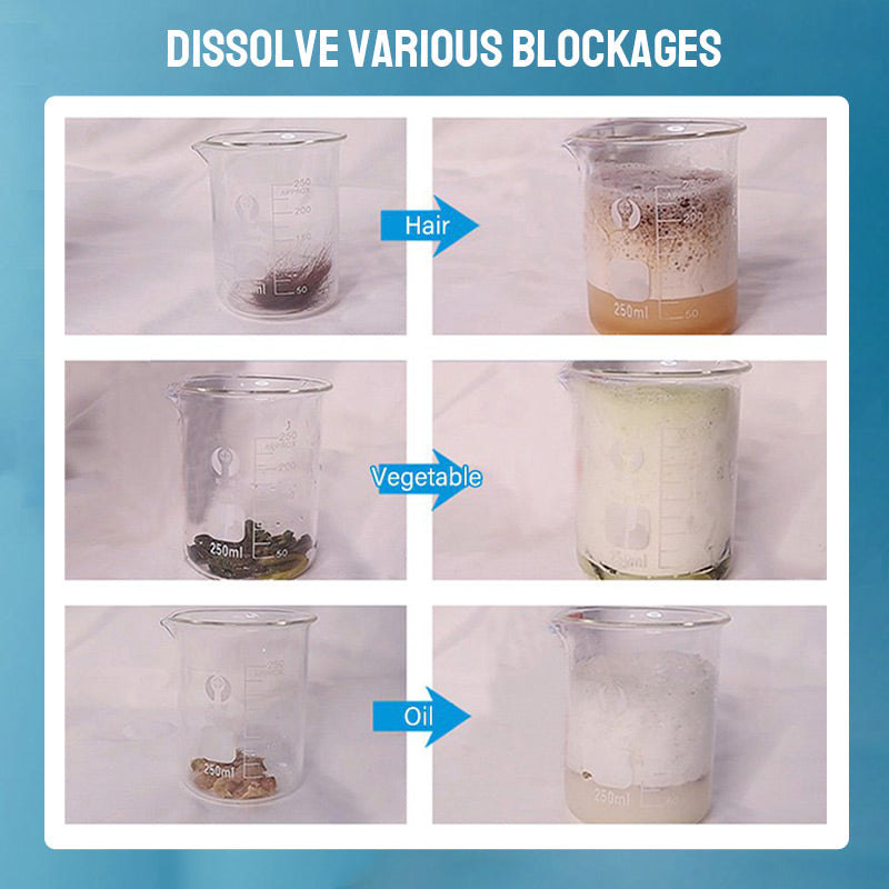 * Erőteljes funkció: Gyorsan feloldja az olyan csőelzáródásokat, mint a haj, papír, szappanos kosz, zöldségek, gyümölcsök, ételmaradékok, zsír és szerves anyagok.